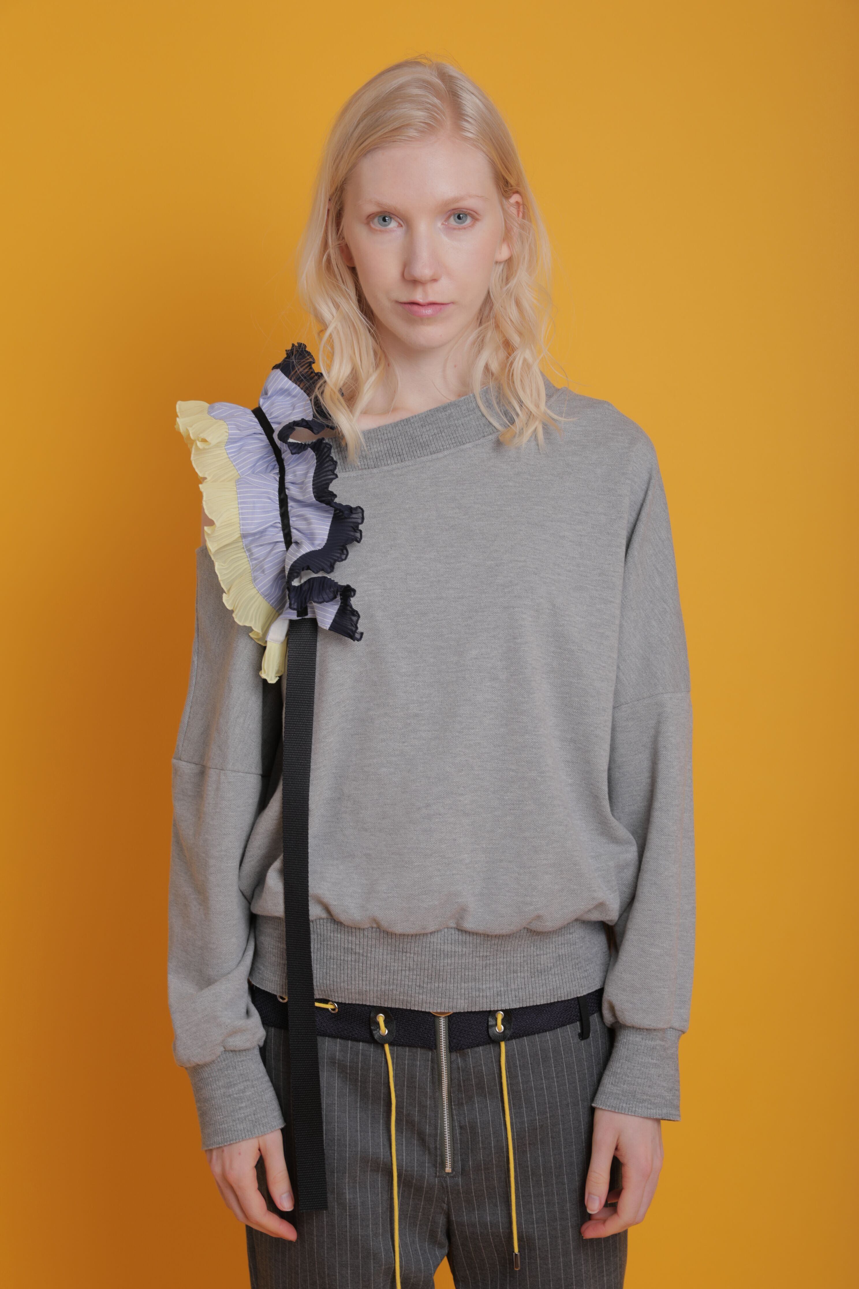 肩のバイカラーフリルがアクセントのアインメトリーデザインプルのオーバーです。