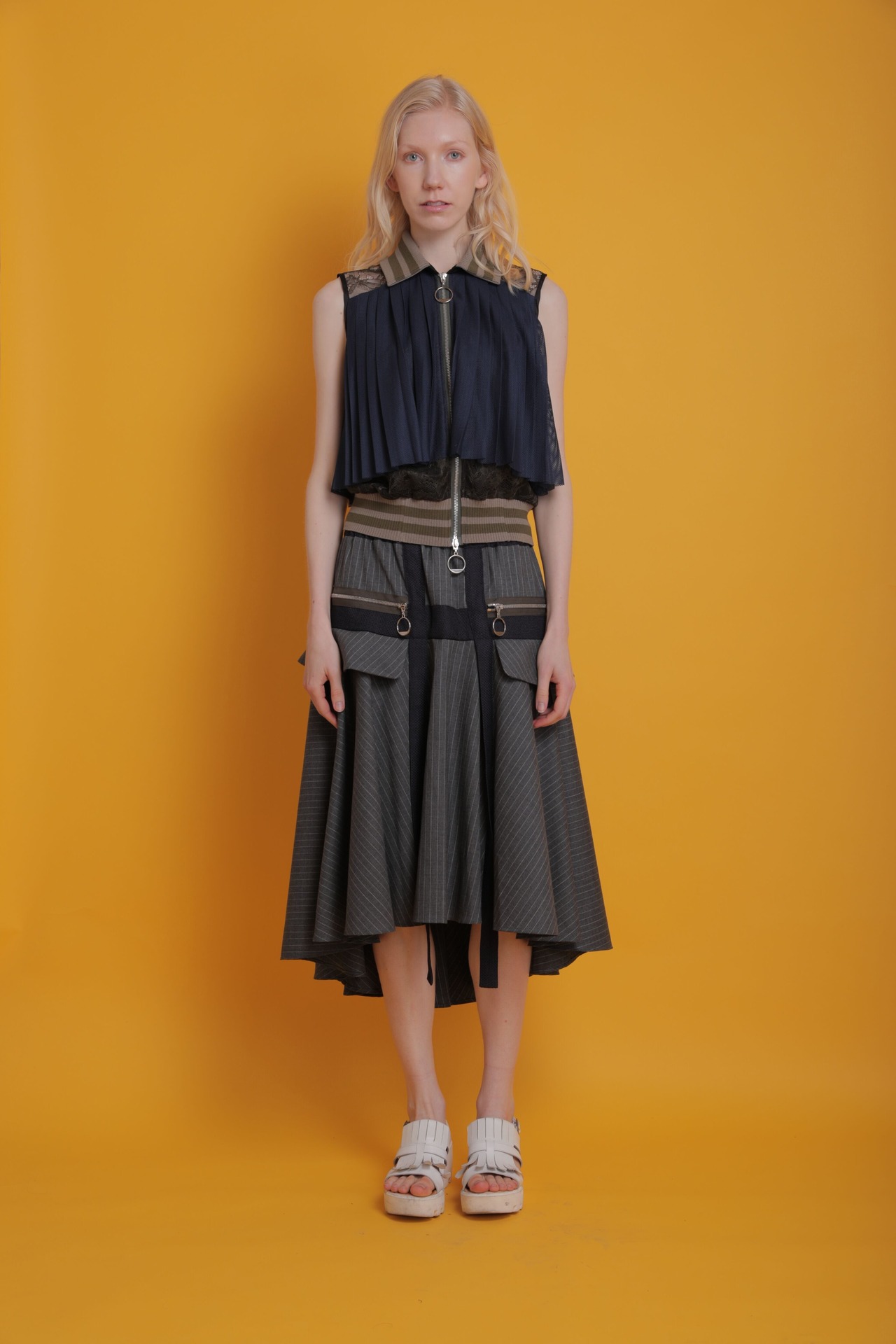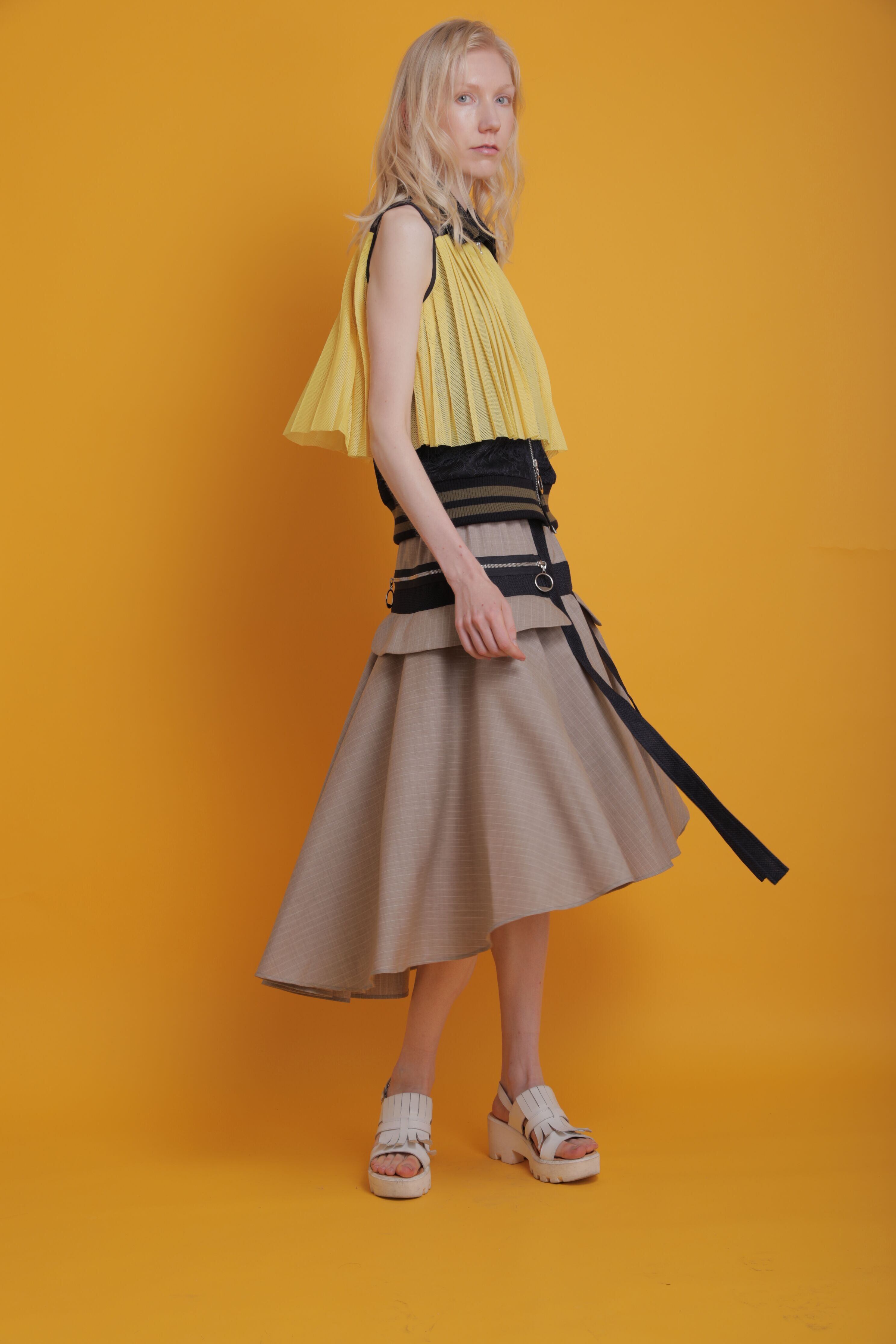 上質なストライプ織りのサマーウールを使用したボリュームたっぷりのデザインスカートです。