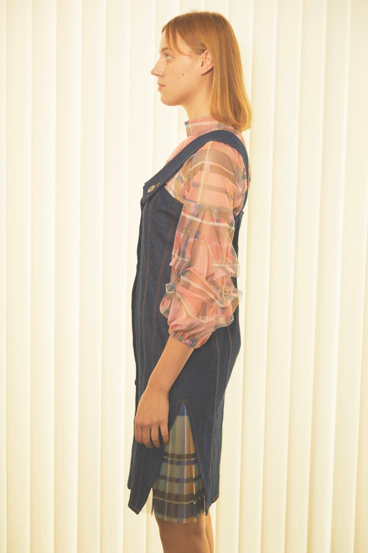 両サイドのスリットから見えるチェック柄プリントのチュールプリーツがアクセントの