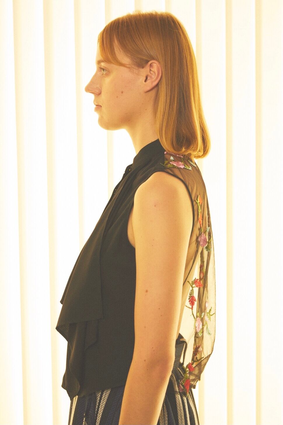 柔らかく質感の良い薄手のツイル素材と、透け感のある刺繍レースを組み合わせたショートブラウスです。前面のスカーフのようなヒダが一風変わったシルエットを演出しています。