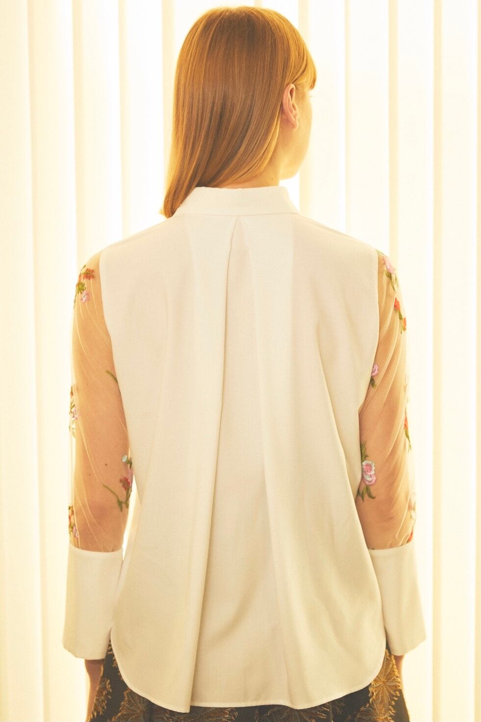 柔らかく質感の良い薄手のツイル素材と、透け感のある刺繍レースを組み合わせたブラウスです。肌の透ける袖とふわっとしたシルエットの女性らしい上品な1着です。